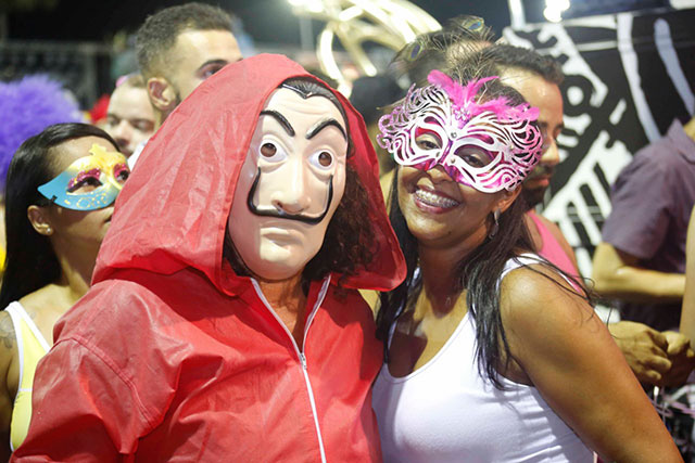 In the streets, another very popular Carnival expression is the blocks – “blocos”. The blocks gather a group of revellers, which can range from only a few dozen up to thousands of people. Very popular, they parade in a semi-organised manner at the sound of a band. It is common to see blocks parading in different streets during the five days of Carnival. Revellers improvise costumes, but in several blocks everyone can “follow the block” or “go behind it” with their normal body clothes. Together with the samba schools, they set the tone of the Brazilian Carnival today.