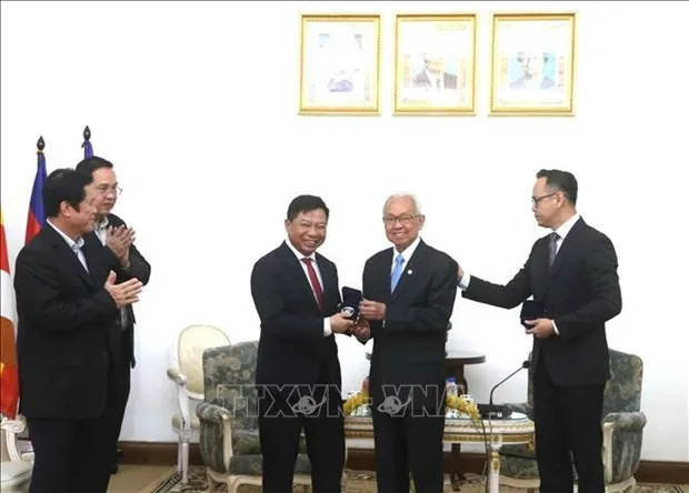 On April 5, Vietnamese Ambassador to Cambodia Nguyen Huy Tang led a delegation to visit and extend greetings to Im Chhun Lim, President of the Constitutional Council of Cambodia (CCC), at the CCC headquarters in Phnom Penh.