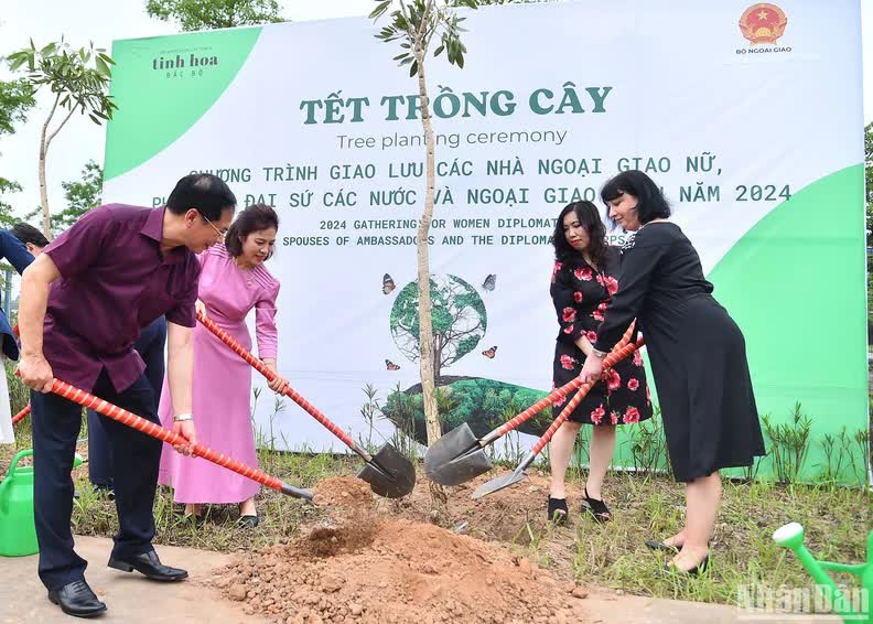 Minister of Foreign Affairs Bui Thanh Son and his spouse Vu Thi Bich Ngoc, Deputy Foreign Minister Le Thi Thu Hang, and Romanian Ambassador to Vietnam Cristina Romila perform a tree planting ceremony at the event.