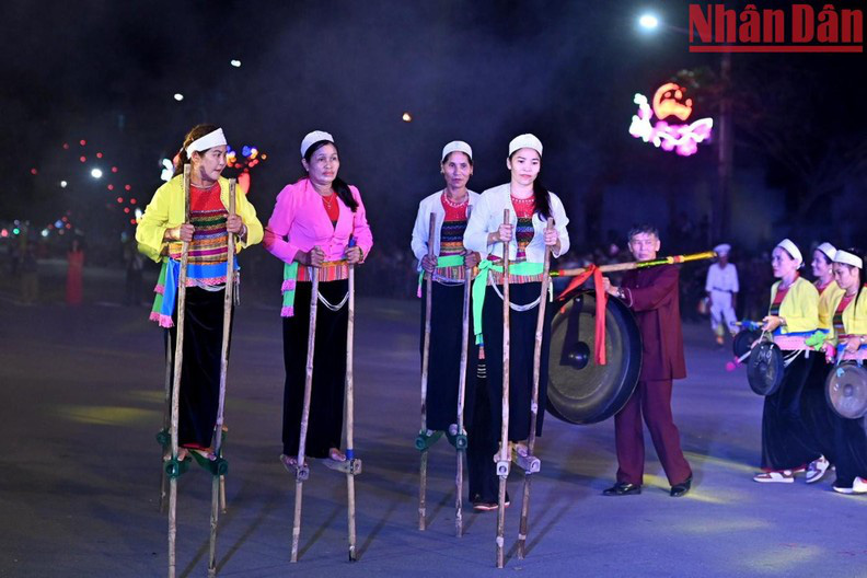 Muong ethnic minority people from Nho Quan district, Ninh Binh province, walk on stilts at the festival