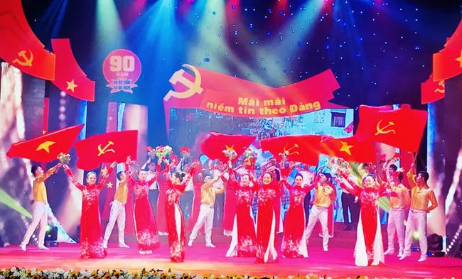The art programme featured elaborately staged musical and dance pieces, documentary films and reportage reenacting the three revolutionary stages of the Party, from its inception to leading the resistance war for national salvation to great victories as well as the building and protection of the socialist Vietnam.