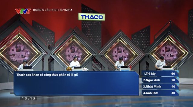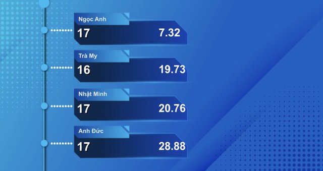 In question 3, Trà My was the only one to provide a different answer than the other three contestants, and she was also the only one to give the correct answer, earning her an additional 40 points. Moving on to question 4, although all 4 contestants answered correctly, Trà My was the fastest. At the end of the Acceleration round, Trà My was still in the lead with 230 points.