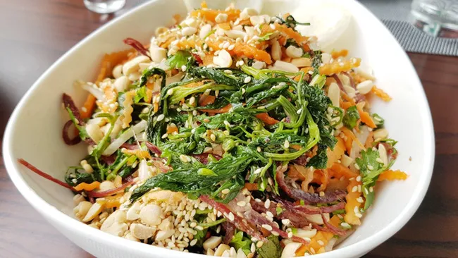 The preparation process is no less elaborate. Since the herb has a pungent smell and bitter taste, it is boiled twice and then wrung dry. After each time it is soaked in ice water to preserve its vibrant colour and crunchy texture. After a few rounds it is finally ready.