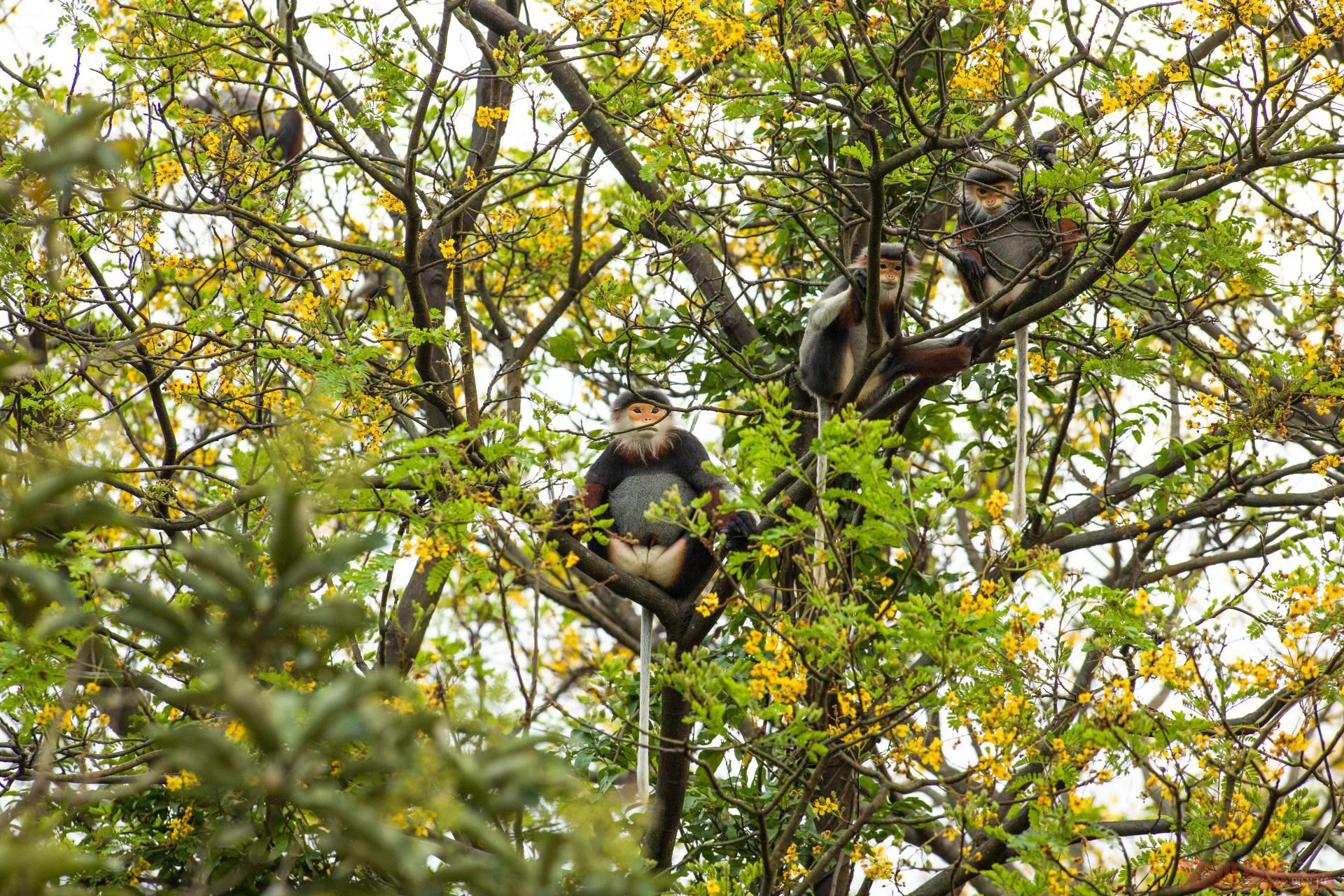 A rare brown-shanked douc family on Son Tra Peninsula. (Photo: HA NAM)