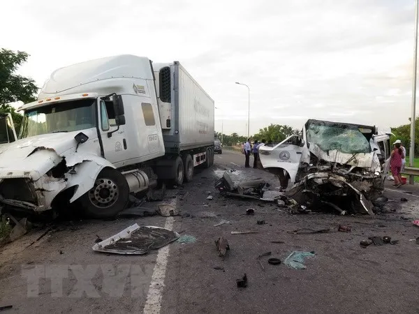 | The scene of an accident in which a coach collided with a container truck early on Monday morning on National Highway No1A in central Quảng Nam Province. 13 people were killed. – VNA/VNS Photo Đỗ Trưởng |