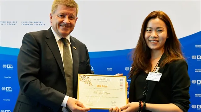 ILO Director-General Guy Ryder presents the 2019 Regulating for Decent Work Prize to Hạnh Nguyễn in Geneva, Switzerland. — Photo courtesy of ILO