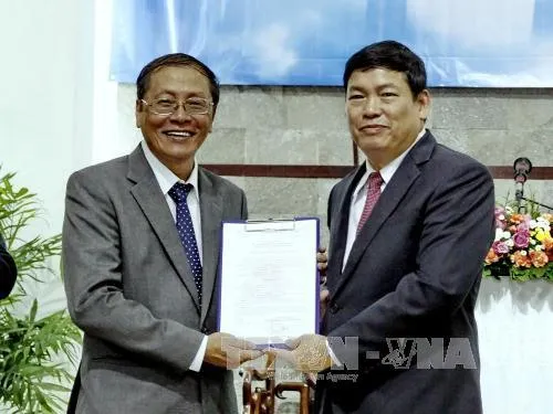 | Bùi Thanh Hà (right), permanent deputy chairman of the Government Committee for Religious Affairs, hands over a certificate for a new Bible School to Pastor Trần Thanh Truyện at a ceremony held in HCM City on Monday. — VNA/VNS Photo Thế Anh |
