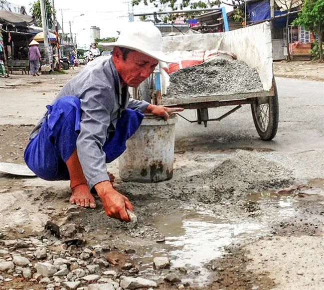 CẦN THƠ — Focusing on the heap of sand and rocks in front of him, the grey-haired man in a faded shirt—gradually darkening with sweat—took little rest as he worked to fill in a road pothole. Next to him was a tricycle carrying his supplies, lying beneath a white board saying “Road under repair. Please slow down”.