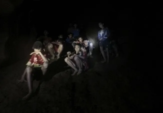 Video released early yesterday by the Thai navy showed the boys in their soccer uniforms sitting on a dry area inside the cave above the water as a spotlight from a rescuer illuminated their faces.