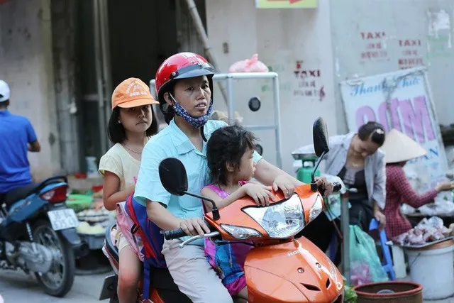 A migrant worker of Thăng Long Industrial Zone in Hà Nội picks up her children. — Photo dantri.com.vn