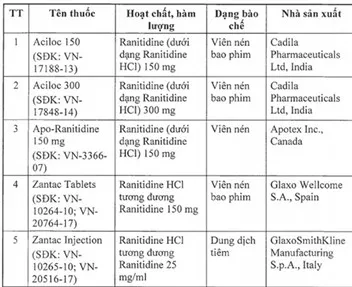 The drugs on the list are Aciloc 150; Aciloc 300; Apo-Ranitidine 150 mg; Zantac Tablets; Zantac Injection; Ratylno-150; Hyzan Tablet 150; Vesyca film Ranitidine 150 mg; Neoceptin R 150; Vesyca Film coated tablet 150 mg; Xanidine Tablet 150 mg; and Zantac Syrup 150 mg/10 ml.