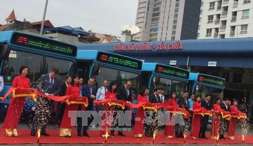 | European-standard buses are put into trial operation on route No 03 in Hà Nội. — VNA/VNS Photo |