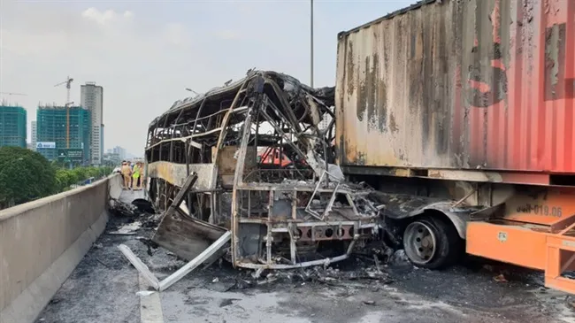 | Passenger bus is burnt after crashing into container.—VNA/VNS Photo |