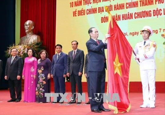 Also at the ceremony, to honour the outstanding achievements of the Party, government and people of Hà Nội after 10 years of adjustment, President Trần Đại Quang on behalf of leaders of the Party and State awarded the First Class Independence Medal for the party, government and people of Hà Nội.