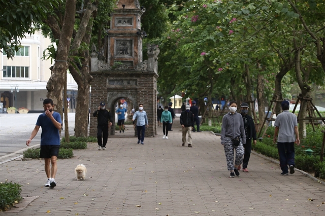 Residents do exercise around Hoàn Kiếm Lake on Wednesday morning. All of them wear face masks and stay two metres away from each other. — VNA/VNS Photo Minh Quyết