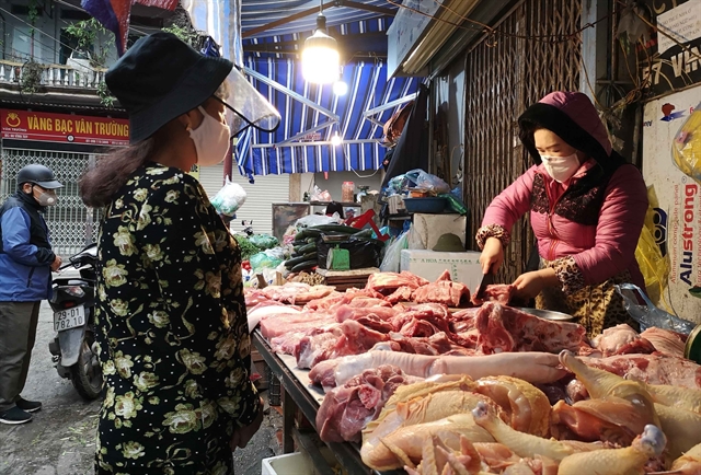 A woman buys pork at Vĩnh Tuy Market. Wet markets, supermarkets and convenience stores are allowed to remain open to ensure food supplies. — VNA/VNS Photo Thanh Tùng A
