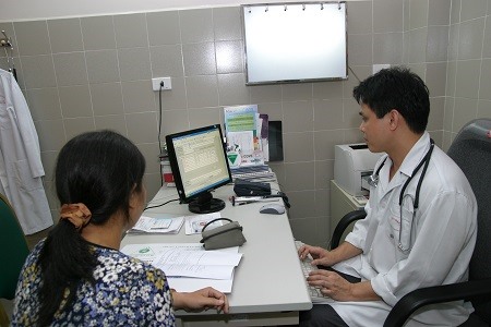 A doctor fills in a digital prescription for a patient in Hà Nội. Digital prescriptions will be used all over the capital city to better manage the prescription and sale of drugs. — Photo baodansinh.vn