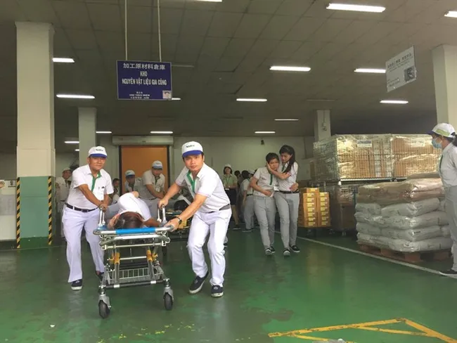 A rehearsal took place at the factory of Japan Nidec Tosok Company in Việt Nam in the Tân Thuận Processing Park with the participation of the company’s workers and officials of hospitals from districts 7, 4 and Nhà Bè, and the HCM City Emergency Centre 115.