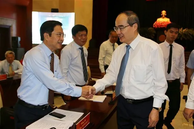 Nguyễn Thiện Nhân, secretary of the HCM City Party Committee, meets with delegates at the HCM City Party Committee conference yesterday. — VNA/VNS Photo Thanh Vũ