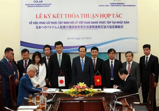 Hà Xuân Tùng (sitting, right), director of the Centre for Overseas Labour under the MoLISA, and Takeshima Tenmi (sitting, left), chairman of Osaka Medical Care Association on July 16 this year signed an agreement on dispatching Vietnamese nursing trainees to intern in Japan. — VNA/VNS File Photo