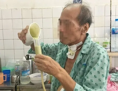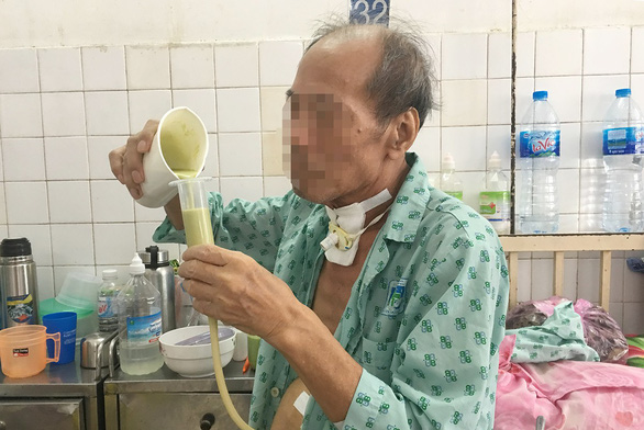 A patient pours nutritious food into a feeding tube provided by HCM City’s Oncology Hospital. Photo tuoitre.vn