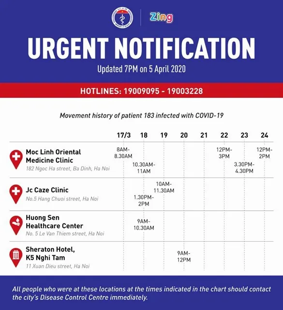 She also visited Jc Caze Clinic at 5 Hàng Chuối Street on March 18 from 1.30pm to 2pm, and on March 19 from 10am to 11.30am.