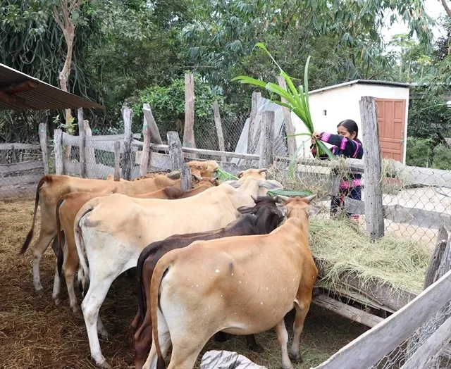 An ethnic farmer feeds her cows. Many households in Bong Biah A Village in the Central Highlands province of Gia Lai have escaped poverty thanks to agricultural development guidance and support. — VNA/VNS Photo Hồng Điệp
