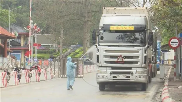 A truck is sprayed with disinfectant at the Hữu Nghị Border Gate, Lạng Sơn Province. This province and six other northern provinces have been asked to cooperate with China to control the COVID-19 pandemic. — VNA Photo