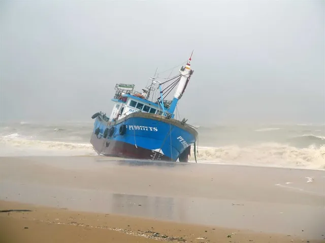 A fishing vessel in the central Phú Yên Province washed ashore on Saturday. — VNA/VNS Photo Phạm Kha |