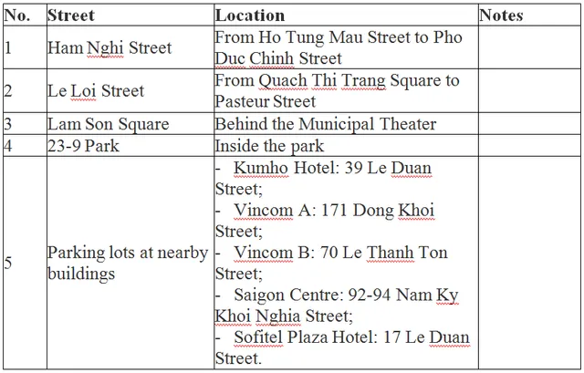 - Nguyen Hue Street, District 1: the section from Le Thanh Ton Street to Ton Duc Thang Street