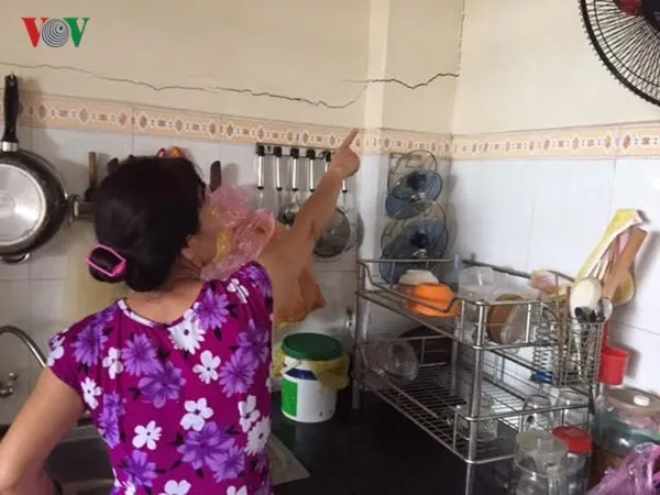 | A resident in Vũng Tàu City’s Ward 12 point to a crack on her house. The crack was allegedly caused by sand overexploitation by a local business. – Photo vov.vn |