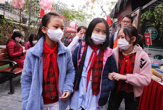 Primary school students wear facemasks on Hà Nội’s Book Street. — VNA/VNS Photo Lâm Khánh