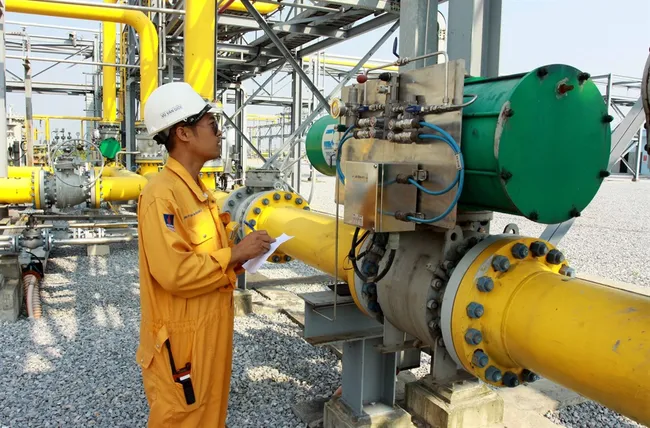An engineer checks a gas collection and distribution system of Hàm Rồng and Thái Bình fields into Tiền Hải industrial park of PV Gas. Shares of the company rose 1.3 per cent on Wednesday.
