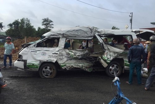 | The 16-seater bus collided with a truck and was damaged in an accident in Đồng Nai Province.-Photo tuoitre.vn |