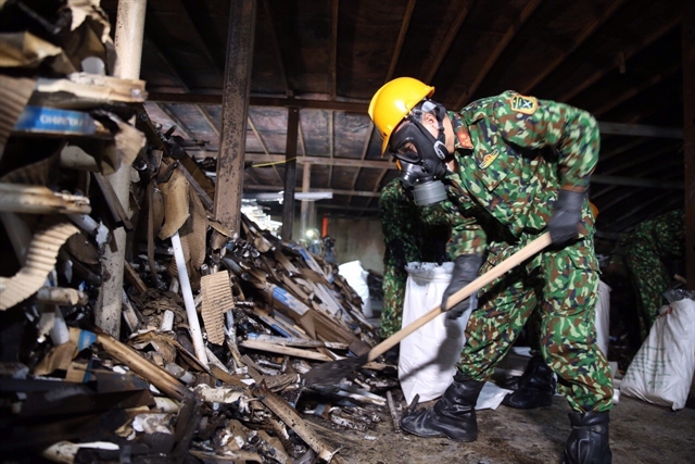 Soldiers of The High Command of Chemicals clean up at the burnt warehouse of Rạng Đông Light Sources and Vacuum Flask JSC on Thursday morning. —VNA/VNS Photo Dương Giang