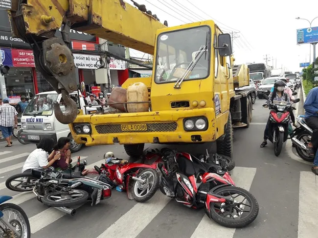 Four motorcycles were crushed consecutively by the crane truck belonging to a local transportation company while waiting for the red light at the February 3 – Nguyễn Văn Linh intersection in the southern city of Cần Thơ.