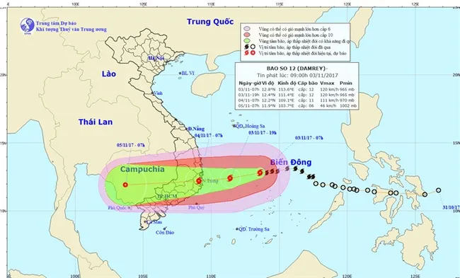 From Friday night until Sunday morning, heavy, continuous rain is forecasted from Ninh Thuận Province to Đà Nẵng City. When storm Damrey moves to the area bordering with Cambodia, the rain will touch Quảng Trị, Quảng Bình and Hà Tĩnh provinces.