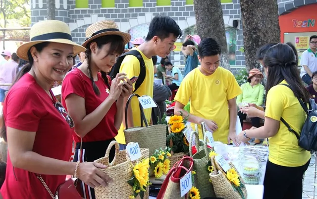 People buy products at the “Sunflower Festival 2018” in HCM City’s Đầm Sen Park today in support of child cancer patients. The festival is part of the “Thúy’s Dream” programme set up by Tuổi trẻ (Youth) newspaper ten years ago. So far more than VNĐ34 billion has been raised to help child cancer patients across the country. This year’s event received support from nearly 10,000 people in HCM City and more than 314,000 others also joined the programme by writing articles and sharing images of sunflower on the social media, thus contributing more than VNĐ150 million (US$6,500) to the fund for cancer patients and supporting VNĐ300 million via a walking event. — VNA/VNS Photo Xuân Dự