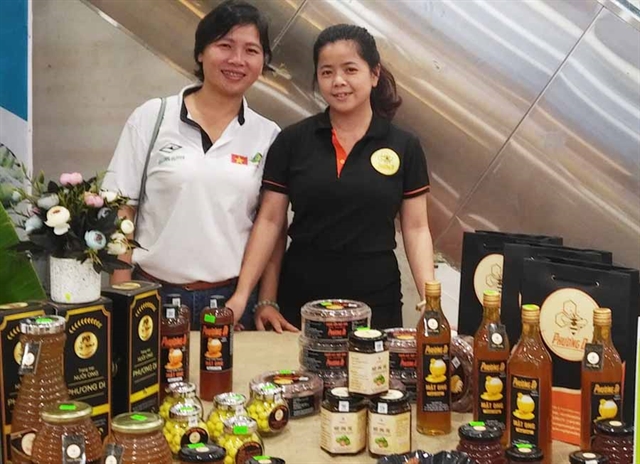 Trần Thị Hoàng Anh (right) introduces her honey products at a trade fair. — Photo gialai.gov.vn