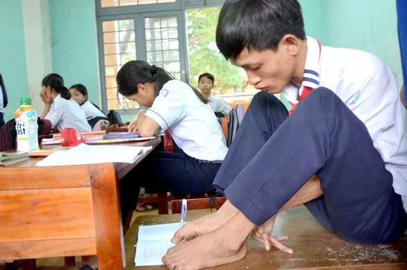 Nguyễn Tấn Sang learns to write letters with his own toes at Đức Phú Commune's Secondary School in Mộ Đức District in central Quảng Ngãi Province. — Photo tuoitre.vn