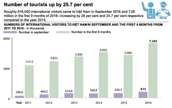 Tourism revenue increased to VNĐ297.16 trillion (US$13.32 billion) in the first nine months, a year-on-year increase of 20.2 per cent, with receipts from international tourists accounting for $8 billion.