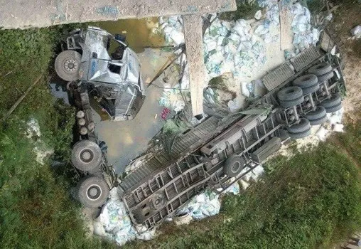 The truck broke into two pieces after colliding with the bridge’s central divide. The driver escaped with injuries while his assistant died trapped in the vehicle.