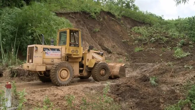 An excavator works to remove land and soil, triggered by a landslide in Quảng Ngãi Province. — VNA/VNS Photo Phước Ngọc
