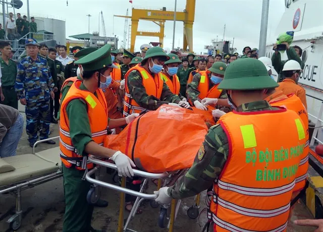 Officials from the naval command of the north central coast carry the body of a fisherman whose boat sank because of Typhoon Damrey near Quy Nhơn Port back to the mainland. Environment Minister Trần Hồng Hà yesterday visited the waters around Quy Nhơn and Bình Định to direct search and rescue efforts for victims of the typhoon which has so far killed 69 people and left 30 others missing. He also provided instructions on the handling of an oil spill caused by the sinking of 8 ships near Quy Nhơn Port on Sunday. — VNA/VNS Photo Nguyên Linh