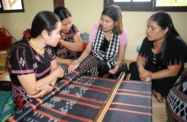 A group of ethnic minority women in the mountainous district A Lưới in the central province of Thừa Thiên-Huế receive training on making brocade products commercially, as part of a programme by Việt Nam Rural Industries Research and Development Institute and USAID aiming to promote sustainable development in the area. VNA/VNS Photo Hồ Cầu