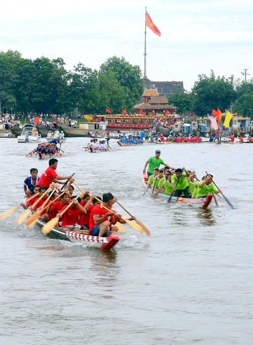 | The traditional boat race is being held on the Hương River in the central province of Thừa Thiên-Huế. The festival sees more than 400 people participating from different districts and towns in the province. – VNA/VNS Photo Hồ Cầu |