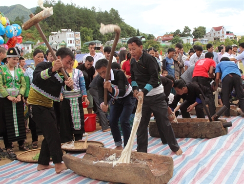 | Ethnic Mông minorities in Lai Châu Province join a competition of grinding glutinous rice dumpling. – VNA/VNS Photo Quang Duy |