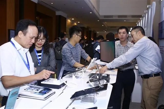 Representatives of businesses visit an exhibition on technological products as part of the conference on cybersecurity. — VNA/VNS Photo Minh Quyết