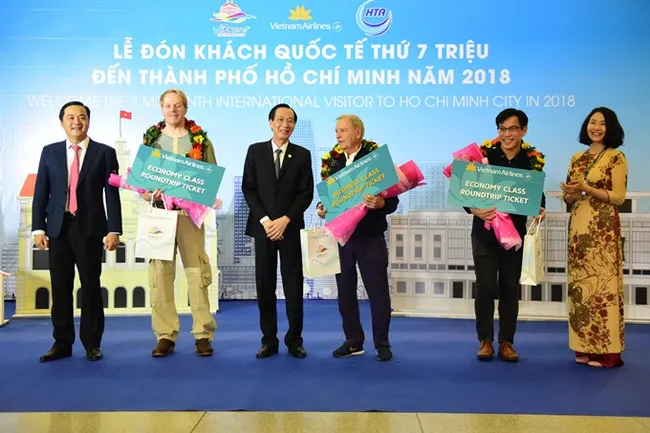 HÀ NỘI — Vietnam Airlines and HCM City’s Department of Tourism on Monday received the 7 millionth international visitor to HCM City this year at Tân Sơn Nhất International Airport.