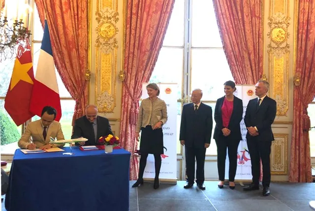 FLC Group’s Chairman Trịnh Văn Quyết (left) and Airbus Executive Vice President and Chief of Sales and Marketing Eric Schulz (right) signed an agreement to purchase 24 A321NEO aircraft for Bamboo Airways, under the witness of General Secretary of the Communist Party of Việt Nam Nguyễn Phú Trọng and the President of France’s National Assembly François de Rugy in March 2018. — VNS Photo